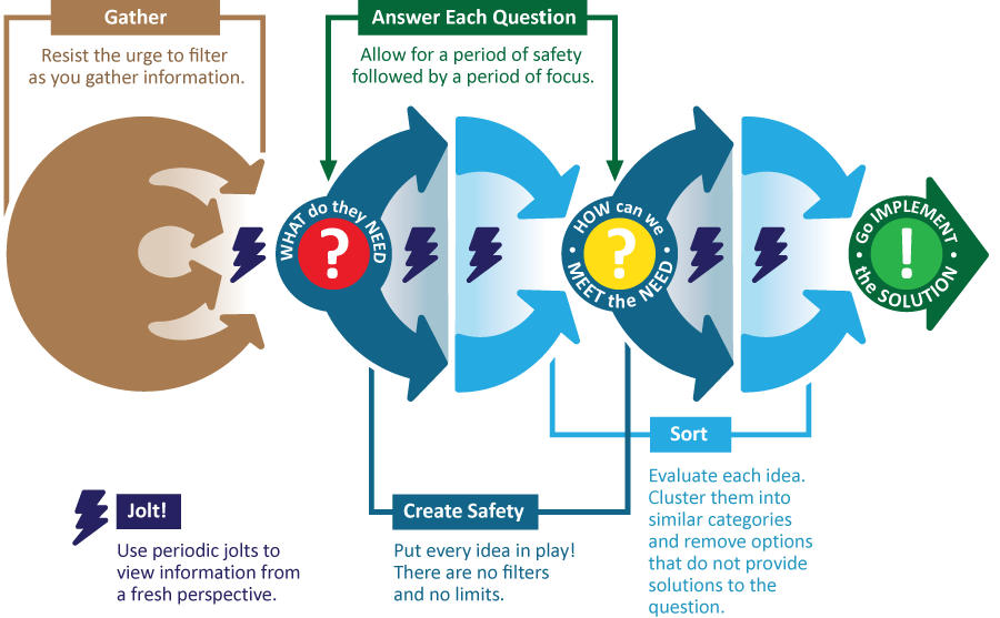 Use a second period of safety to brainstorm ways to answer this new question. Use jolts to shake things up, then remove items you do not need before acting on the remaining solutions.